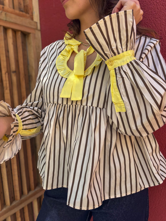 Blouse à rayures col montant smocké