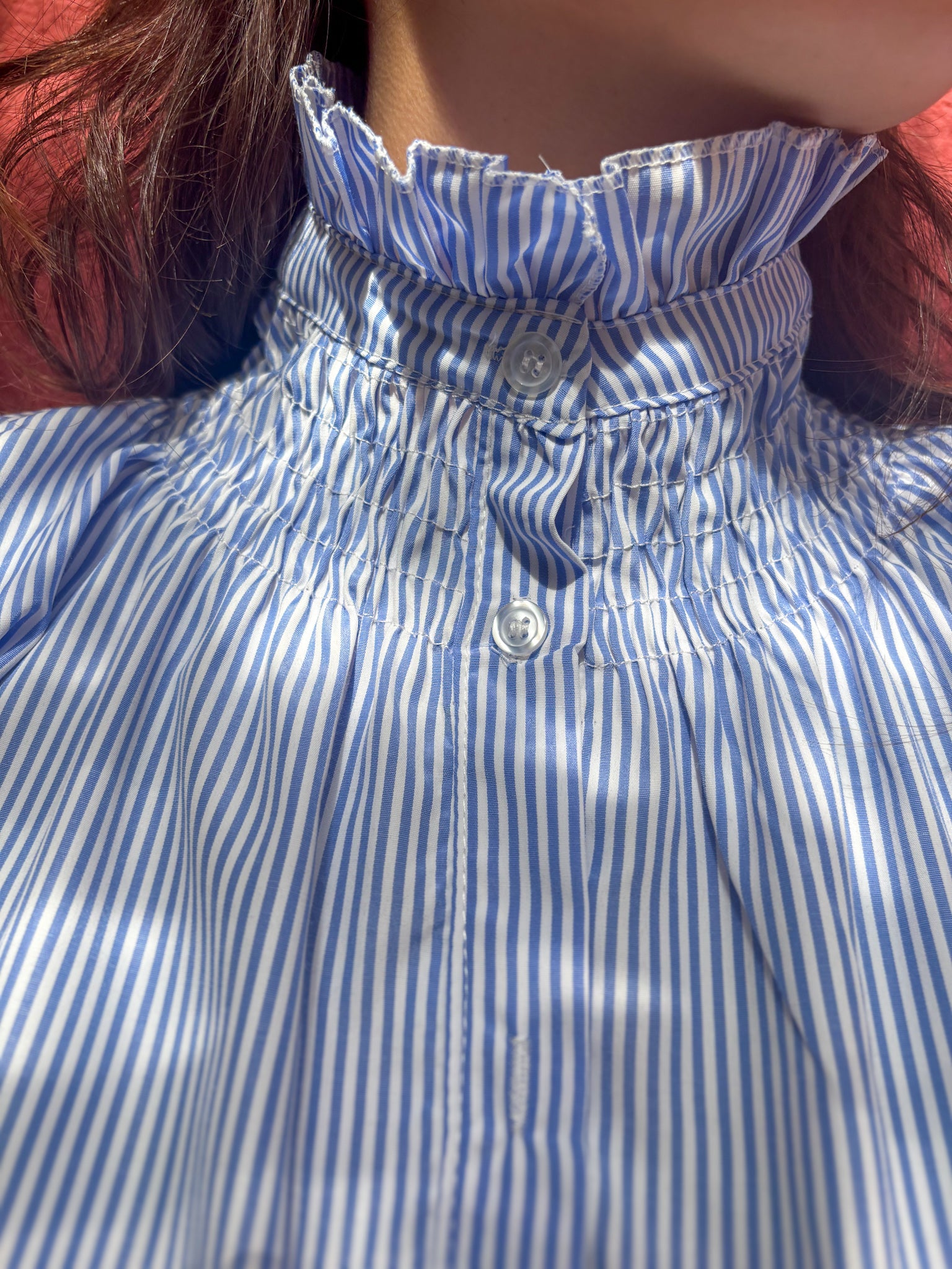 Blouse élégante à rayures dotée d’un col montant smocké et de poignets smockés pour une finition raffinée. Sa fermeture par boutons sur le devant apporte une touche classique et permet un porté modulable.