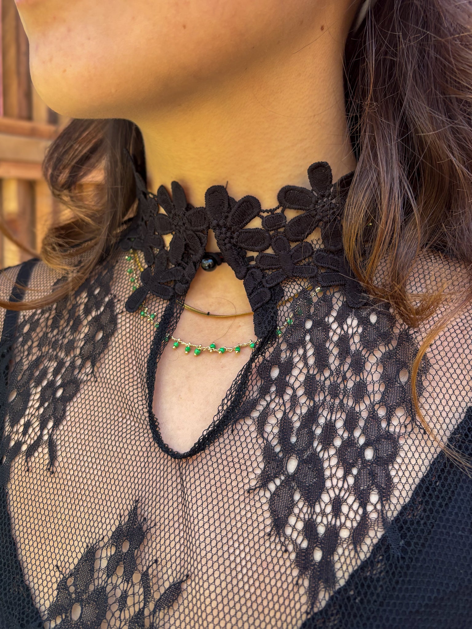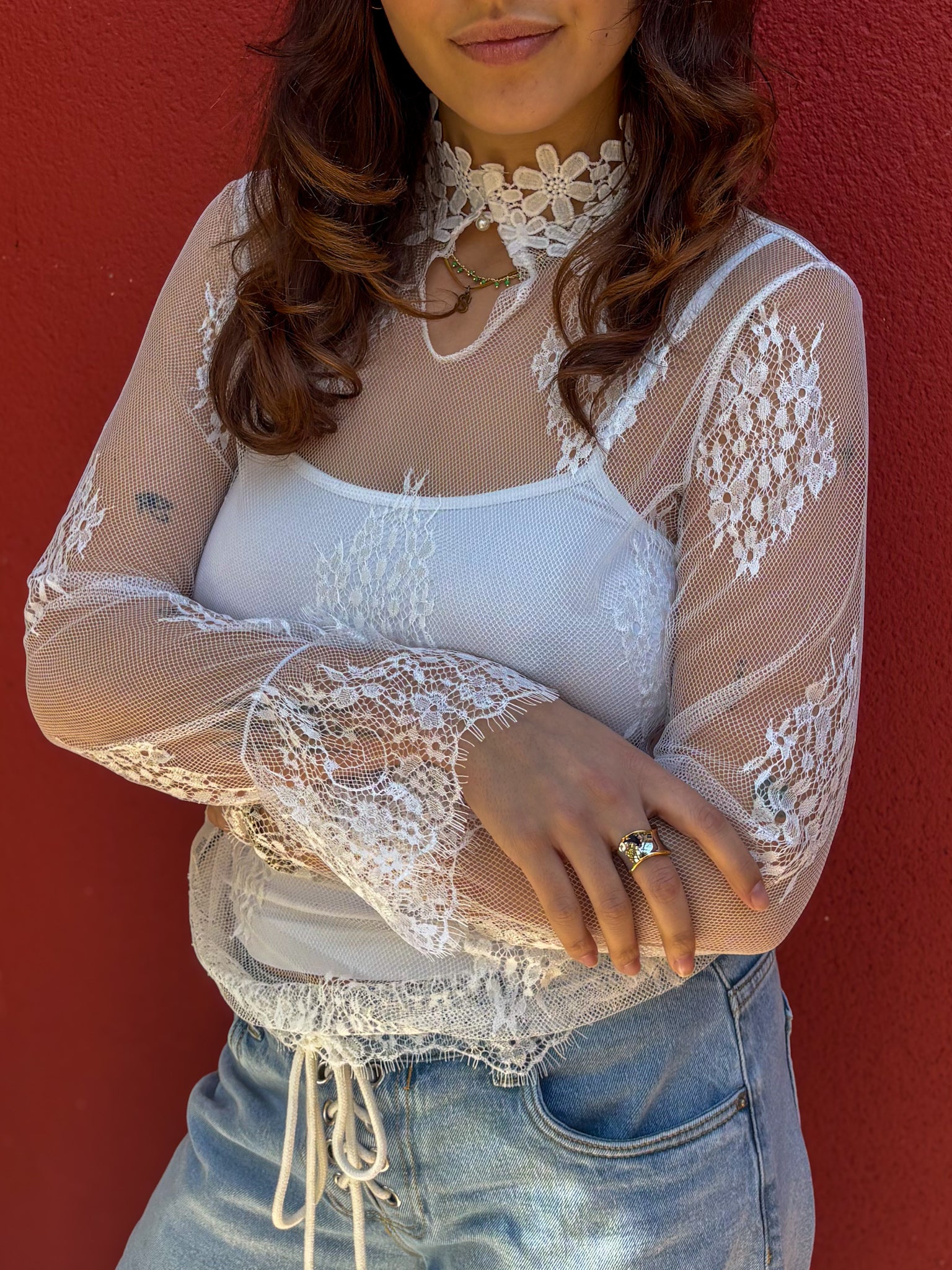 Haut élégant en dentelle avec manches longues et col montant. Confectionné en viscose douce et fluide, il offre confort et sophistication. Fermeture pratique par un bouton à l'encolure. Pièce incontournable pour un style raffiné et intemporel.