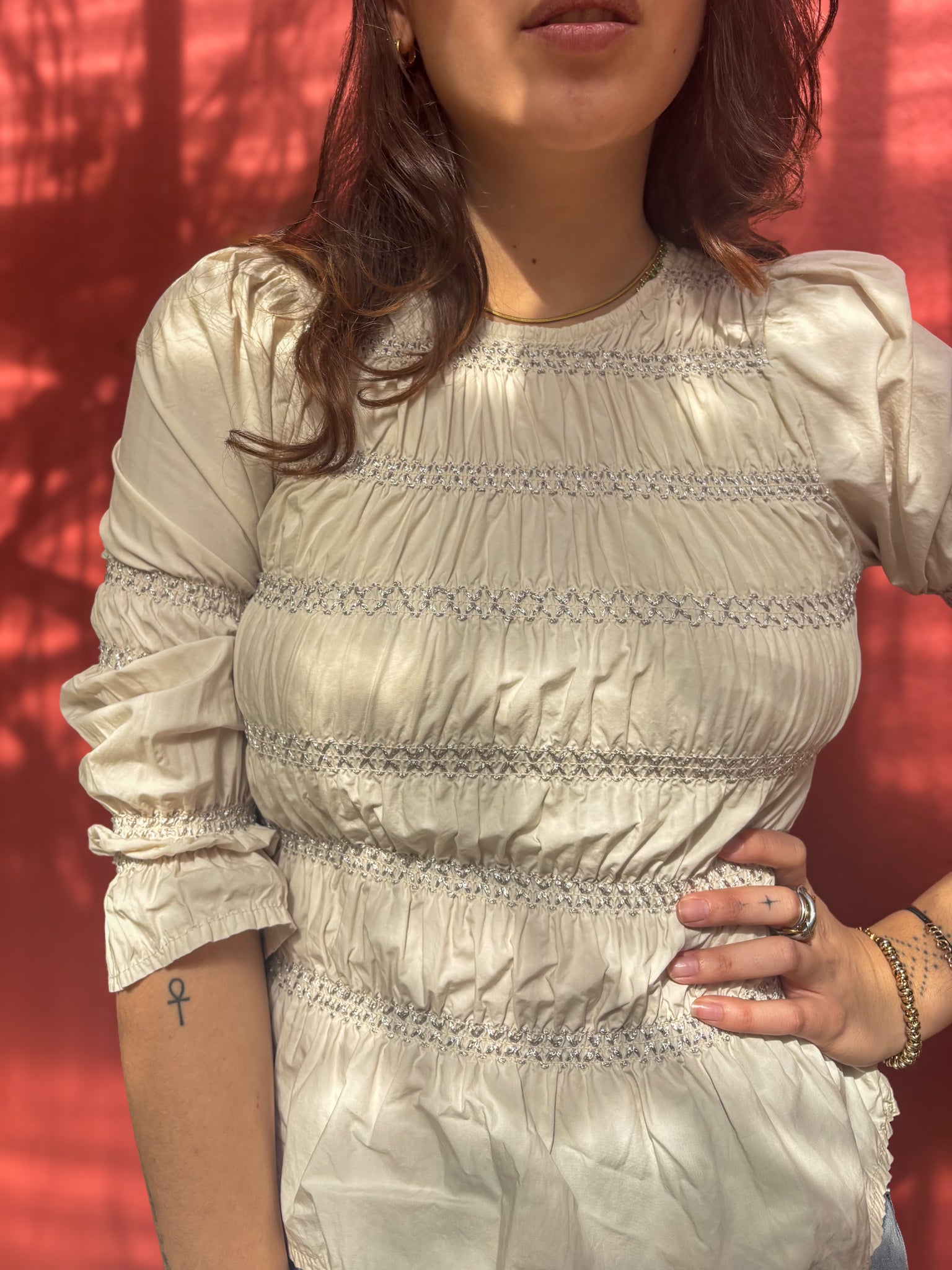Blouse féminine au style smocké. Ses détails froncés structurent joliment la silhouette, tandis que ses manches légèrement bouffantes apportent une touche de douceur. Une pièce moderne et flatteuse, parfaite pour un look chic et décontracté.