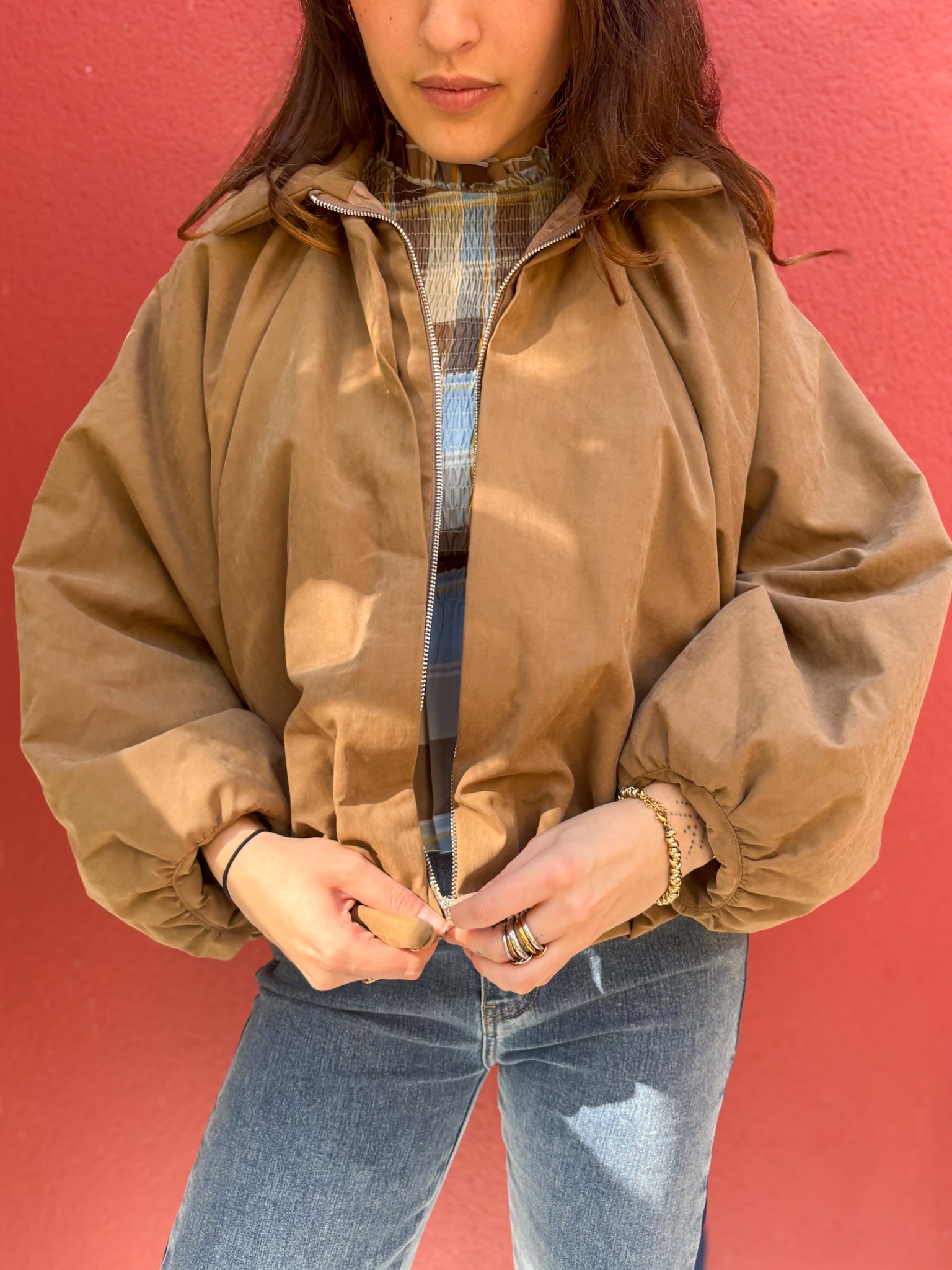Veste bomber au design moderne avec manches chauve-souris bouffantes pour un volume tendance et une silhouette contemporaine. Sa teinte beige camel élégante s’associe facilement à tous vos looks, tandis que sa fermeture zippée apporte une touche pratique et urbaine.