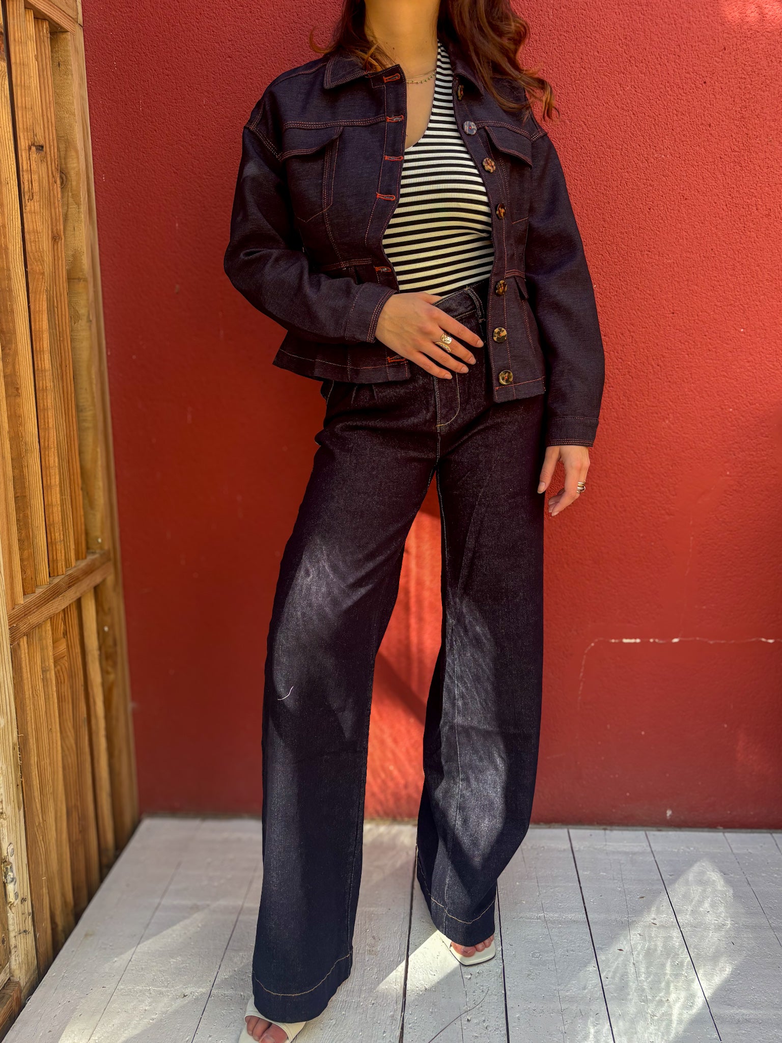 Veste en jean cintrée au design structuré avec surpiqûres apparentes pour une finition travaillée et moderne. Sa coupe ajustée met en valeur la silhouette, tandis que sa fermeture par boutons apporte une touche classique et intemporelle. Confectionnée en tissu épais de couleur brute, elle allie style et tenue parfaite.